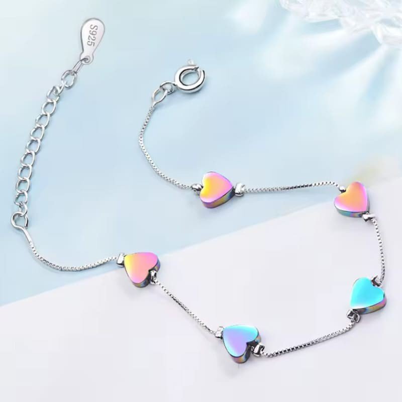 Färgglada Hjärtan: Armbandet pryds av fem små, charmiga hjärtan med en fängslande iriserande (skiftande) effekt. Hjärtats färger skiftar i regnbågens toner beroende på ljuset, vilket ger en unik och magisk look.